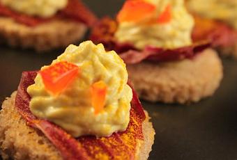 Su ogni ciuffetto di crema di piselli disporre un pezzetto di peperone rosso tagliato molto sottilmente e terminare la preparazione con una spolverata di curcuma macinata.