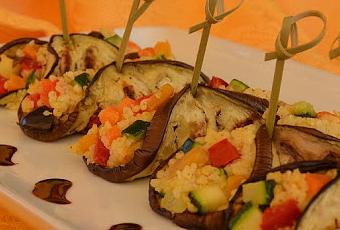 Affettare la melanzana in modo da formare tante fettine tonde, cuocere su piastra ben calda, senza condimenti.