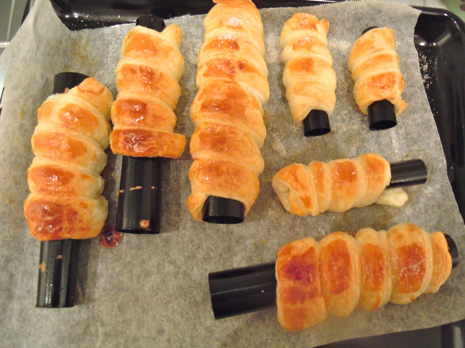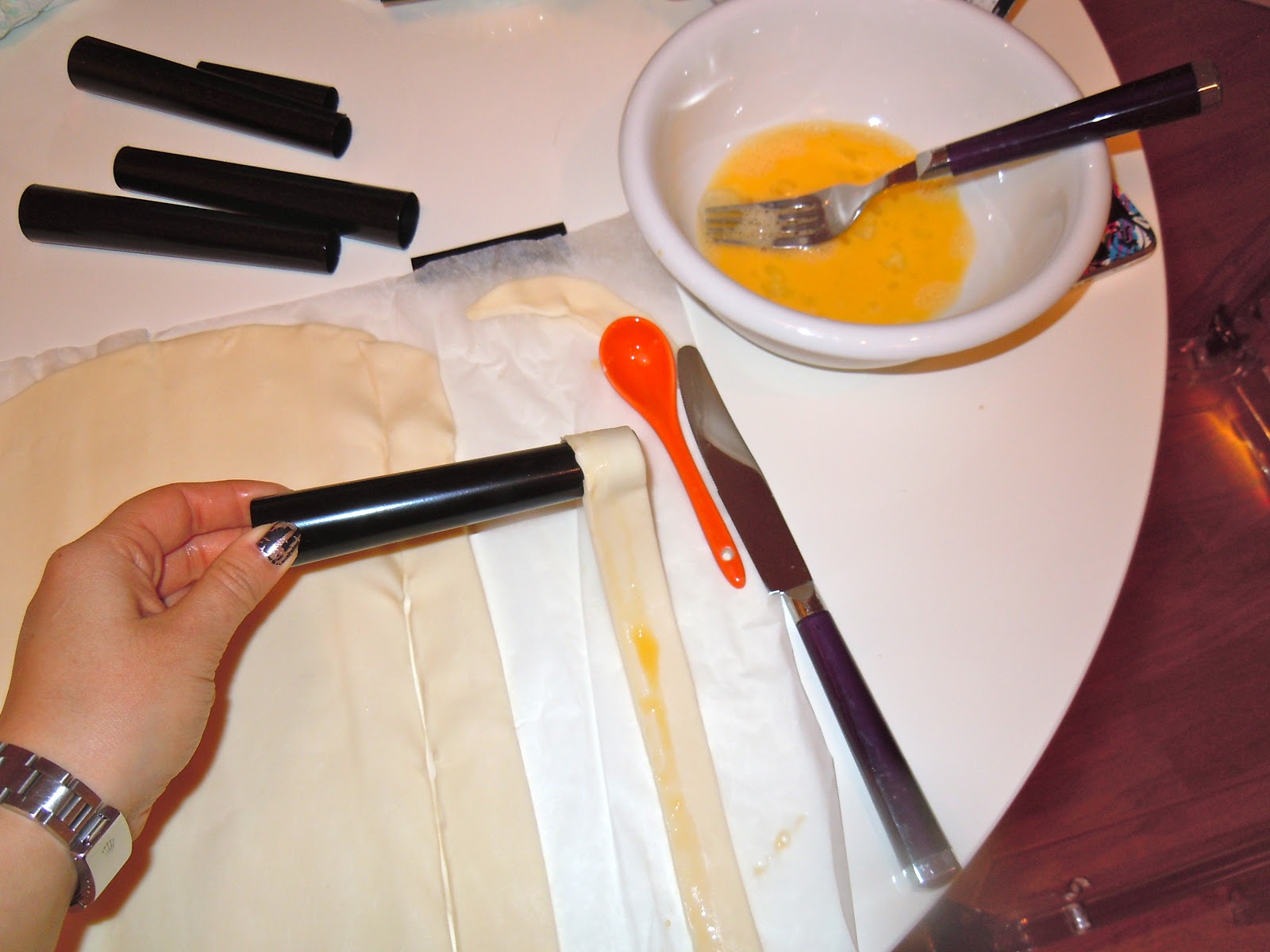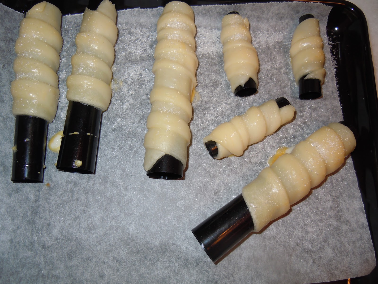 Prendere un rotolo di pasta sfoglia e ritagliare delle strisce di circa 2 cm. Sbattere un uovo dentro ad una scodella e spennellare metà striscia di pasta, in tutta la sua lunghezza, in modo che faccia da collante quando si avvolge la striscia intorno alla forma (come nel disegno)
