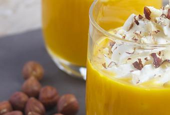 - Servite la crema di zucca nei bicchierini, guarnendo con la spuma di robiola e la granella di nocciole.