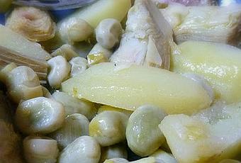 Facciamo appassire i cipollotti nell’olio, aggiungiamo i carciofi, le fave e le patate e facciamo insaporire.