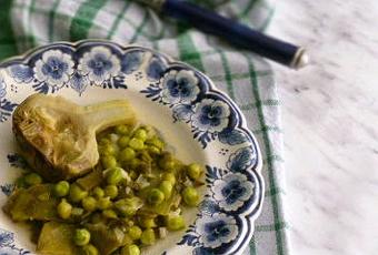Procedimento:Pulire i carciofi lasciando le foglie tenere intorno al cuore, tagliarli a metà verticalmente, eliminare la peluria e immergerli in acqua con succo di limone per evitare che anneriscano.Pulire anche i gambi e immergerli nell'acqua acidulata.Sbucciare i piselli, tagliare le estremità a una decina di baccelli, (quelli più sodi e brillanti) togliere la pellicina interna e i fili duri ai lati, tagliarli a metà e tenerli da parte, separati dai piselli.Tritare i cipollotti, tenendo separate le parti bianche dalle foglie verdi. Tritare anche il prezzemolo.Coprire il fondo di una casseruola con dell'olio evo, far dorare lo spicchio di aglio e toglierlo. Versare la parte bianca dei cipollotti tritati e farli appassire a fiamma bassa. Aggiungere la metà del prezzemolo, far stufare per qualche minuto e unire le foglie verdi tritate insieme ai baccelli. Far insaporire, versare 150 ml di acqua calda, coprire e cuocere per 15 minuti. Aggiungere i carciofi e cuocere a pentola coperta per altri 10 minuti. Per ultimo versare i piselli, salare, macinare del pepe, meglio bianco, ricoprire e cuocere per altri 10 minuti circa. Versare il succo di mezzo limone e il rimanente prezzemolo tritato, mescolare, aggiustare di sale, coprire e ultimare la cottura per 2 minuti ancora.Per 2.Nota: Se vedete che il liquido scarseggia, aggiungere qualche cucchiaio di acqua calda. Diversamente se il piatto alla fine è troppo liquido, diluire in una tazza un cucchiaio di farina in un poco del brodino, versare nella casseruola , mescolare e cuocere per 5 minuti.