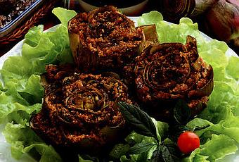 - A fine cottura unite il pane raffermo sbriciolato ed il parmigiano. Prendete ciascun carciofo e farcitelo con qualche cucchiaio del composto preparato assieme ad un paio di cubetti di fontina.
