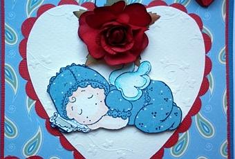 cartoncino bazzil blu, cartoncino bazzil rosso, carta embossata color panna, carta Nikki Sivils “Something for Everyone”, timbro della Magnolia colorato con distress reinkers e con la tecnica del paper piecing (qui il tutorial), scallop intorno al cuore hand made.