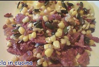 ingredienti una scatola di manzotin una patata lessa a fette semi di zucca sgusciati e tostati noci tritate mandorle tritate pomodori secchi sott'olio tagiati a pezzetti piccoli mais sale olio e.v.o. mettere tutti gli ingredienti insieme in una ciotola e mescolare oppure impiattare creando un letto di patate a fette con sopra tutto il resto buon appetito! carne in scatola manzotin alla paprika per primo e secondo caldi