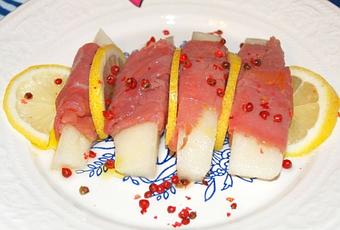 Nel frattempo taglia a fettine il melone e ricavane dei bastoncini lunghi 6 o 7 cm possibilmente tutti uguali. Togli la carne dal frigo e avvolgi ogni fetta di carpaccio attorno a ogni bastoncino di melone disponendoli nel piatto uno vicino all'altro.