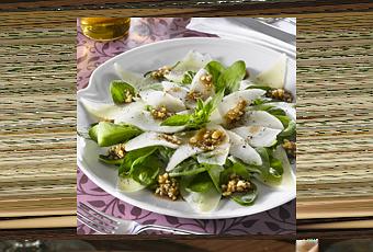 un antipasto diverso dal solito le pere sono servite con pecorino noci spinaci con un condimento agro-dolce