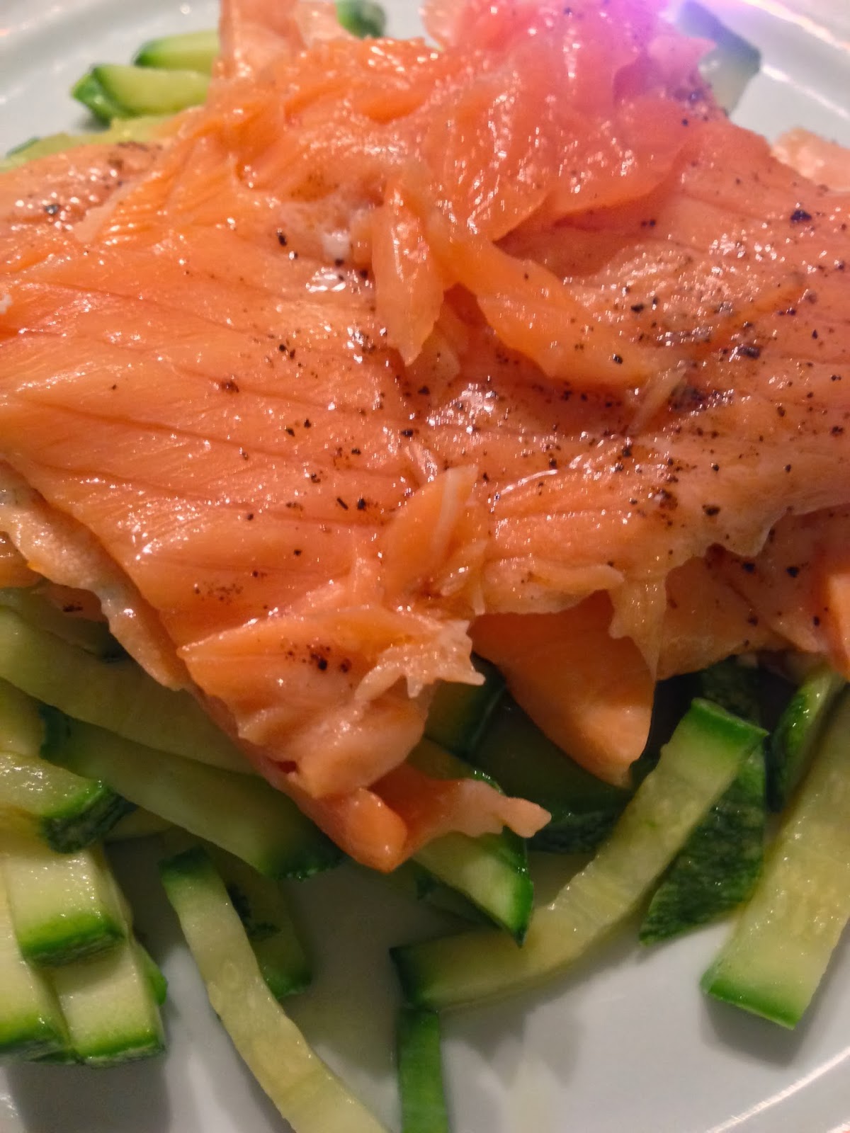 Place a layer of zucchini on a plate and lay down the salmon on it.