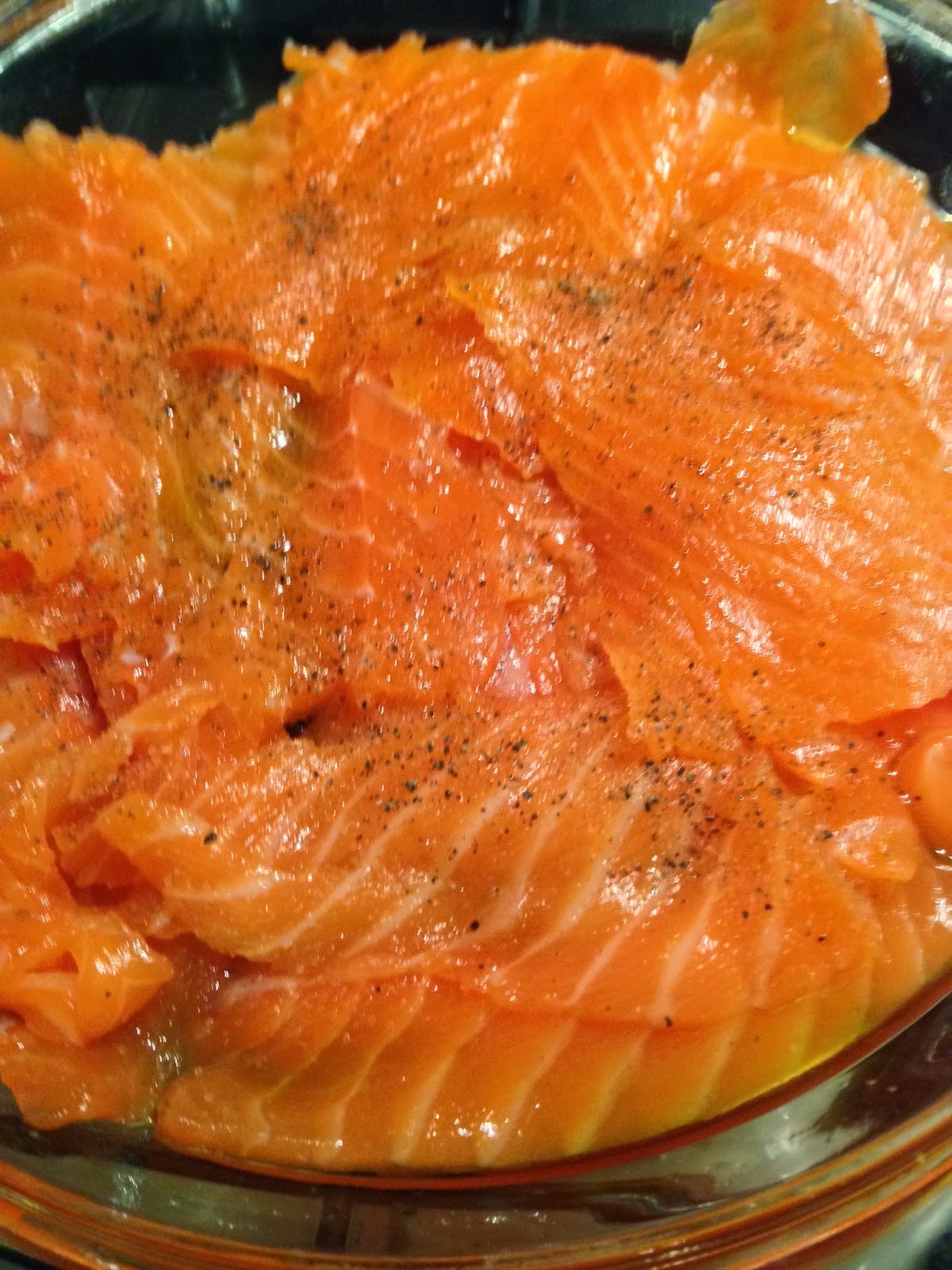 Tagliare il salmone in senso orizzontale onde ottenere delle fette sottilissimeIn una teglia di vetro disporre le fettine con un filo d'olio sale e pepe coprirlo un coperchio e cuocerlo a vapore mettendo la teglia di vetro sopra una pentola con poca acqua in ebollizione per soli 3 minuti