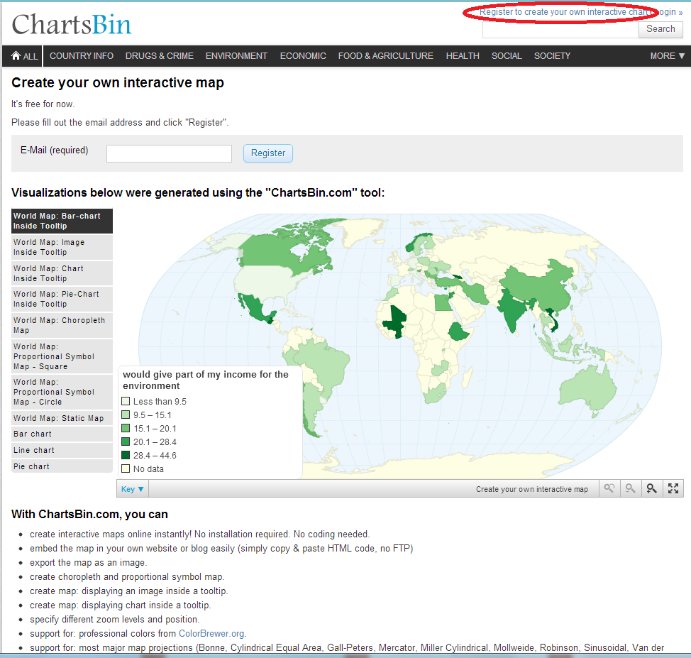 Altra segnalazione, rapidissima. Nel sito chartsbin.com possiamo sia consultare carte tematiche e grafici (ripartiti per tematica) sia realizzarne a nostra volta, dopo esserci registrati.