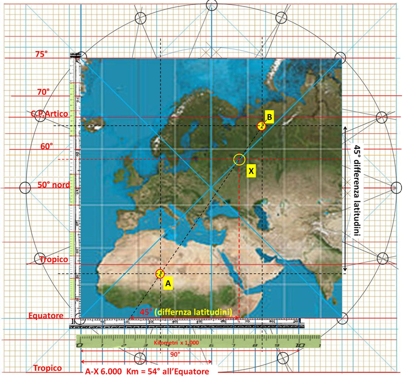 Tracciamo la retta che attraversa le due località (ortodromica). Da dove questa retta tocca l’Equatore si dovrebbero far partire i 45° di differenza di latitudine. Dopo i 45° si dovrebbe tirare la retta che attraverserà nel punto X l’ortodromica. Siamo a 58° nord. Il tratto A-X dà l’esatto valore reale dell’ortodromica; riportandolo sull’Equatore: come ha già evidenziato una delle diagonali.Io uso settori da 4,5° e 9°. In 90° riporto 10 settori da 9°. Ma a 45° e 90° i metodi si sincronizzano.90° sono 90°. Ogni 9° sono 1.000 Km. 90° sono 10.000Km.