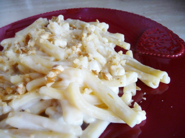 Cuocere la pasta in abbondante acqua salata, scolarla e raccoglierla in una zuppiera, cospargere con il parmigiano, versare sopra la salsa di gorgonzola e panna e mescolare.