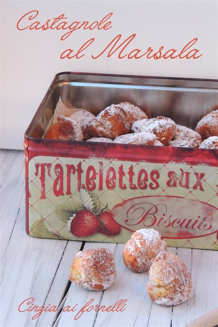 Eccomi tornare con una ricetta adatta ai prossimi giorni di festa. Carnevale è alle porte e quest'anno è decisamente in anticipo rispetto agli anni precedenti. Non so voi, ma io adoro dedicarmi ai fritti in questo periodo... Mi ricorda la mia infanzia, quando a preparare chiacchiere, bugie, frappe, cenci, tortelli dolci e castagnole erano le mie zie, le sorelle di mio padre. La mia nonna materna invece si faceva sempre aiutare da mio nonno e insieme preparavano vassoi di bugie (chiacchiere/frappe/cenci/crostoli... tanti nomi ma sostanzialmente sono la stessa cosa) che noi nipoti ci gustavamo la domenica quando andavamo da loro, per il solito pranzo domenicale che era più simile ad un pranzo di nozze in verità, ed era sempre così. Quanti bei ricordi conserviamo noi nipoti e ovviamente non parlo solo riguardo al cibo.. Certo è che da questo punto di vista siamo stati molto fortunati ad avere una nonna cuoca.. Altro che dieta con la nonna!!!... Non esisteva proprio.. Purtroppo non ho avuto la fortuna di conoscere la nonna paterna, e me ne dispiace perché da come me ne hanno sempre parlato, era una gran donna, saggia e giusta. Perdonatemi, come al solito mi perdo in chiacchiere invece di parlarvi delle castagnole al Marsala che sono a dire poco: favolose!!...