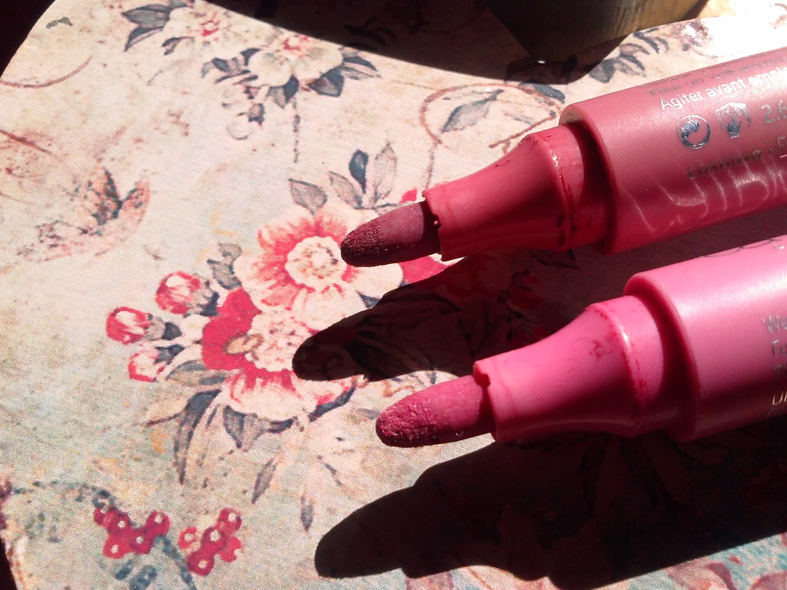 La punta in feltro è esattamente come quella dei pennarelli da disegno, nè troppo grossa nè troppo sottile, comoda da usare e facilmente "dirigibile" sulle labbra. Il colore è pieno già dalla prima passata, ma è anche modulabile, quindi si può decidere l'intensità da dare alla tinta. A me piacciono molto, ho letto in giro molte review negative, ma io davvero non ho nulla di negativo da dire su queste tinte. La durata è molto buona, almeno 7 ore come appena messa le fa, dopo inizia a svanire, ma in maniera uniforme e non a chiazze. Ha un leggero sapore di caramella che tuttavia dopo un po' non si sente più. La texture non è male, è esattamente come un pennarello, nè troppo liquida nè troppo densa, e non si secca prima che abbiate completato l'opera.