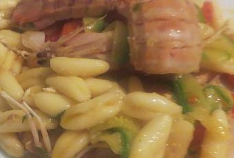 I cavatelli sono una tipica pasta pugliese di semola di grano duro, spesso utilizzate per primi piatti a base di pesce. Qui sono abbinate alle cicale di mare, nome toscano delle canocchie, zucchine saltate e un tocco di pomodoro fresco.