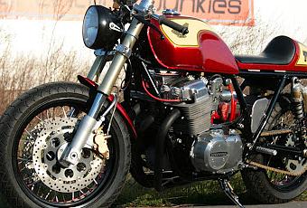 Questa cafè racer è stata preparata in Grecia con componenti dall'USA e dall'Olanda: codone di BCR, motore revisionato, air box depennato, cerchi da 17”, forcella anteriore Kawa ZXR400.