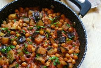 Procedimento:Mettere in ammollo i ceci in acqua fredda e lasciarli per 24 ore. Scolarli, sciacquarli bene e metterli a lessare con la foglia di alloro e i grani di pimento. Lavare la melanzana, tagliarla a dadi e metterla in un recipiente con acqua fredda e un cucchiaio di sale per far prendere eventuali note amare. Coprire con un piatto a contatto per evitare che galleggi. Dopo mezz'ora scolare la melanzana e asciugarla benissimo. Friggerla leggermente in bagno d'olio di arachidi, salare leggermente e metterla su carta da cucina per far assorbire l'olio in eccesso.Quando i ceci saranno cotti ma non al punto di disfarsi, insomma devono restare appena al dente, salare leggermente, far cuocere ancora 5 minuti, scolarli, scartare la foglia di alloro e i grani di pimento e tenerli da parte. Tenere l'acqua di cottura calda.Prendere un tegame che possa andare in forno, versare 3 cucchiai di olio evo e far appassire l'aglio con la cipolla. Aggiungere il pomodoro, mescolare e sfumare con il cucchiaio di aceto. Dopo 2 minuti aggiungere i ceci e la melanzana. Macinare del pepe nero, unire parte del prezzemolo tritato e mescolare. Aggiustare di sale se serve, versare 2 mestoli dell'acqua di cottura dei ceci e infornare a 180 gradi per 40 minuti, controllando i liquidi. Se serve, versare ancora un poco dell'acqua di cottura dei cedi. Trascorsi i 40 minuti, sparegere il prezzemolo tritato rimanente e infornare ancora per 5 minuti.E' un piatto vegano eccezionale, se invece non siete vegani, accompagnatelo con un poco di feta e non ve ne pentirete!
