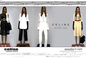 Più rilassata del solito... Phoebe presenta per la Resort 2012 di Celine una forte carica di jacquard floreali, un bianco puro per camicie e pantaloni segnati da trasparenze e tutta una serie di colori pastello, dal cobalto al fucsia, decisamente primaverili, che creano forti contrasti con le superfici nere, grigie e caffé, ancora invernali, della pelle sfoderata. I pattern floreali, minuti, quasi musivi, delicati si frantumano con la scelta del patchwork colorato, effetto regoli, di borse (tremende) e di qualche capo fortunatamente isolato. Meglio le prove precedenti che rimangono sicuramente molto più ispirate.