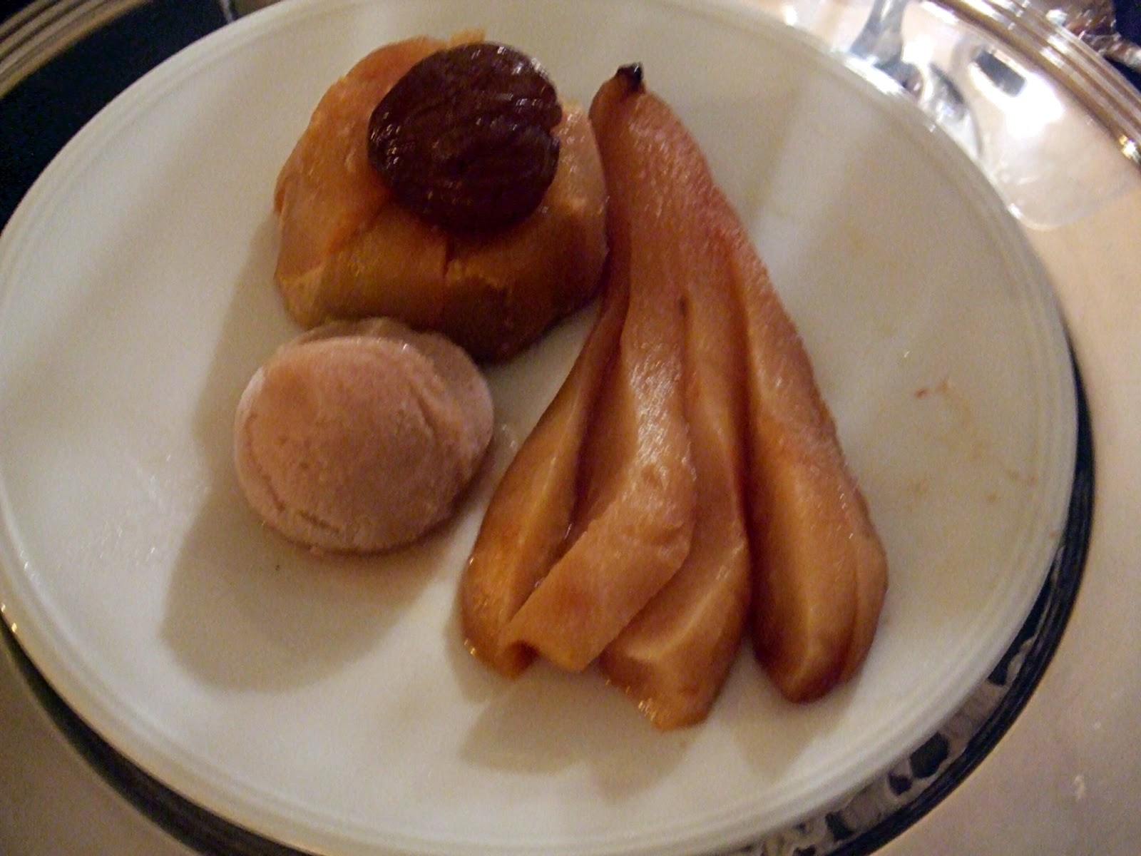 Flan di marroni e pere caramellate con sorbetto di marron glassé
