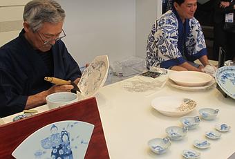 Dopo il brindisi a base di sakè, due artigiani di Arita, un vasaio e un decoratore, hanno dato dimostrazione delle loro doti al pubblico.