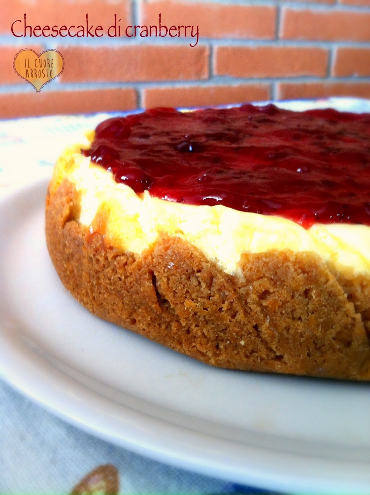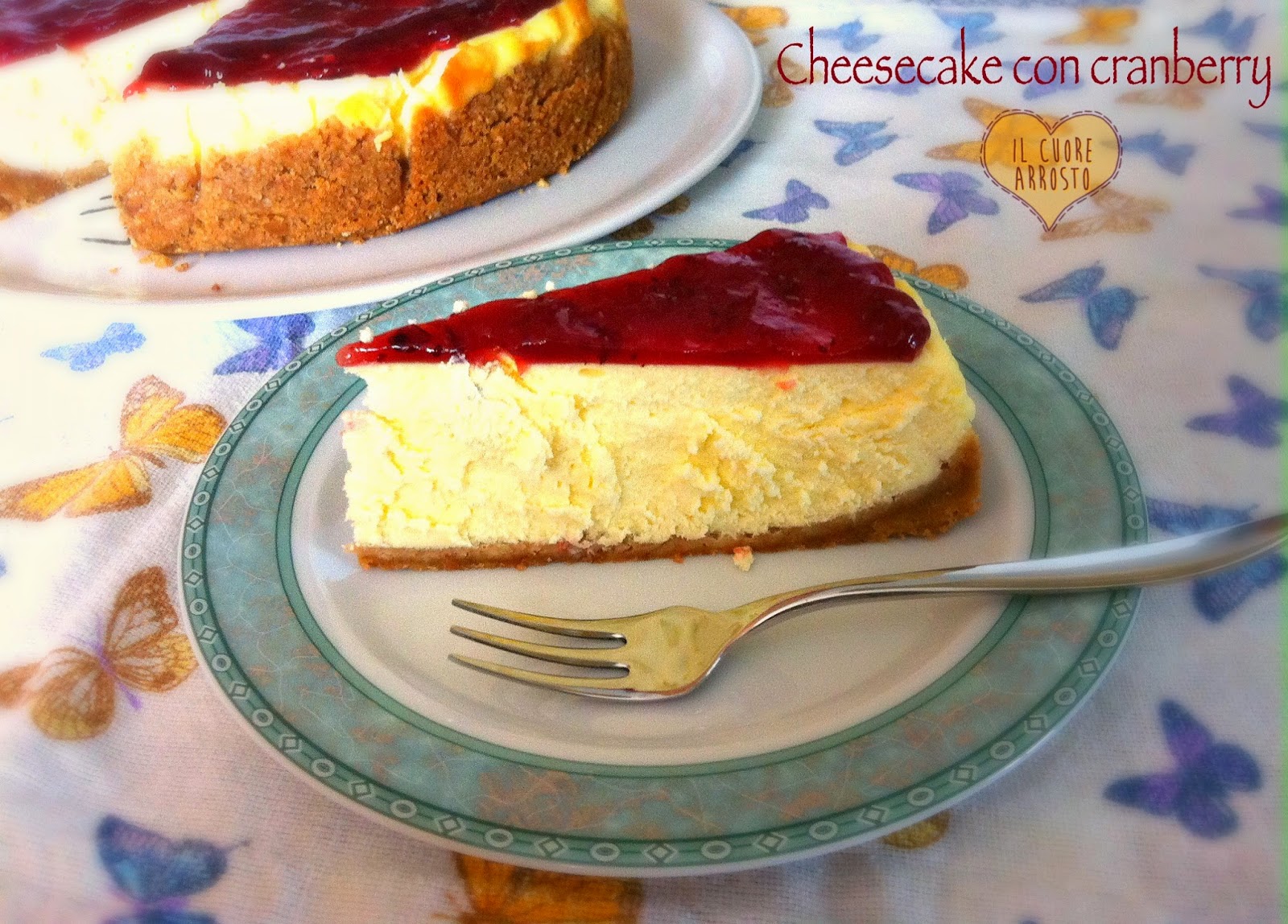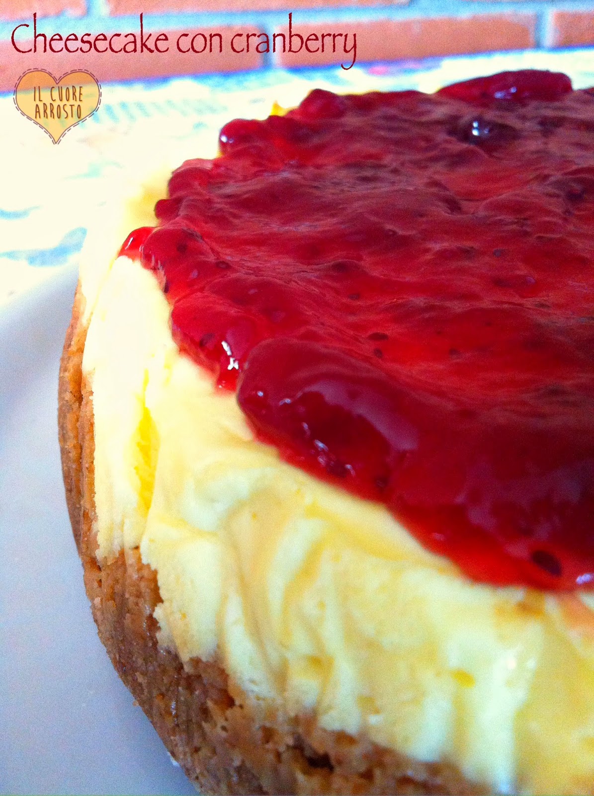 Amo il cheesecake e i miei colleghi lo sanno...si presenta sempre così bene, si arricchisce della frutta fresca, del cioccolato, del caramello...così vellutato anche da solo, senza farcie...la ricetta è quella che uso solitamente di Giallo Zafferano salvo qualche piccola variante, per esempio non l'ho glassato in superficie con la panna acida ma l'ho inserita direttamente nell'impasto, nella base ho omesso lo zucchero che è già presente nei biscotti...il topping è la marmellata di cranberry, buona come lo sono tutti i frutti di bosco!