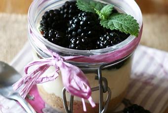 Blackberry and white chocolate cheesecake in a jar with lemon balm syrup