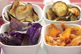 Sgocciolate le ultime verdure e mettetele su carta da cucina. Portate le chips in tavola nelle rispettive ciotoline e salatele.