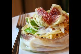 - 70 gr di chitarrini all'uovo; - olio extravergine q.b.; - 1 spicchio d'aglio; - 1 rametto di rosmarino; - pecorino stagionato; - 3 fichi; - 4 fette di lardo di maiale felice molto sottili.