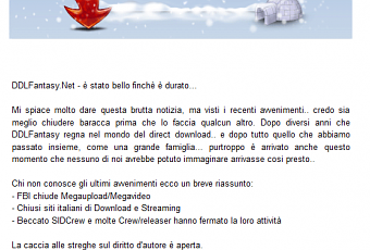 Il mondo del file sharing quest anno ha conosciuto un periodo non proprio favorevole : dopo la chiusura del mito di Megaupload un altra vittima ha chiuso i battenti,si tratta di DDLFantasy.Il motivo infatti della chiusura di quest’utila e’ dovuto ai vari avvenimenti che hanno colpito molti siti che condividono contenuti digitali online.I titolari di DDLFantasy infatti hanno comunicato che hanno deciso di intraprendere loro questa decisione sulla chiusura senza aspettare che lo facciano altre persone.Si assiste ad una vera e propria caccia,i siti di file sharing vengono oscurati e la motivazione principale e’,cosi’ dicono,la salvaguardia del diritto di autore.