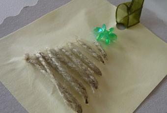 Con ago e filo verde ho realizzato la semplice struttura di un albero sopra un cartoncino colorato; mi è bastato seguire il tracciato leggero che avevo lasciato con la matita almeno per avere un percorso da seguire per poi “cucire” sul foglio; strana tecnica ma con un effetto finale carinissimo.