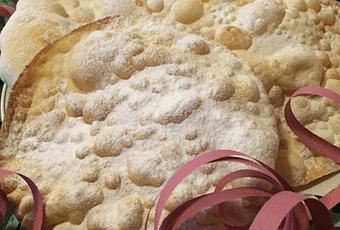 Formare dei dischi da circa 12 cm di diametro e friggerli nell’olio bollente. Prima di servirli cospargerli di zucchero a velo. Queste frittelle, tipiche svizzere e molto simili alle nostre chiacchere, hanno la particolarità della sfoglia molto sottile che si scioglie in bocca. Il nome Chnüblätz (foglietto da ginocchio, liberamente tradotto dallo svizzero tedesco) deriva dalla tradizione di tirare la pasta appoggiandola al ginocchio.