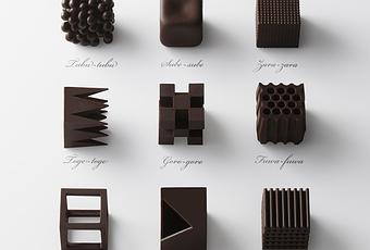 Nendo, Chocolatexture: 1 –“tubu-tubu” praline di piccole gocce di cioccolato; 2 – “sube-sube” bordi e angoli arrotondati; 3 – “zara-zara” granulare; 4 – “toge-toge” punte affilate; 5 – “goro-goro” quattordici piccoli cubi collegati; 6 – “fuwa-fuwa” morbido e arioso, con molti piccoli fori; 7 – “poki-poki” una cornice fatta di bastoni di cioccolato; 8 – “suka-suka” un cubo vuoto con pareti sottili; 9 – “zaku-zaku” sottili lamelle di cioccolato alternate a formare un cubo