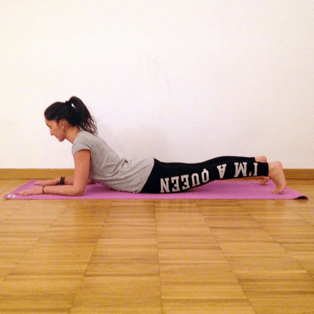 1) Parti da sdraiata a pancia in giù, appoggiando l'avambraccio e il palmo della mano sul tappetino e stando bene attenta che i gomiti restino sotto le spalle, non più avanti o più indietro, formando un angolo di 90 gradi.