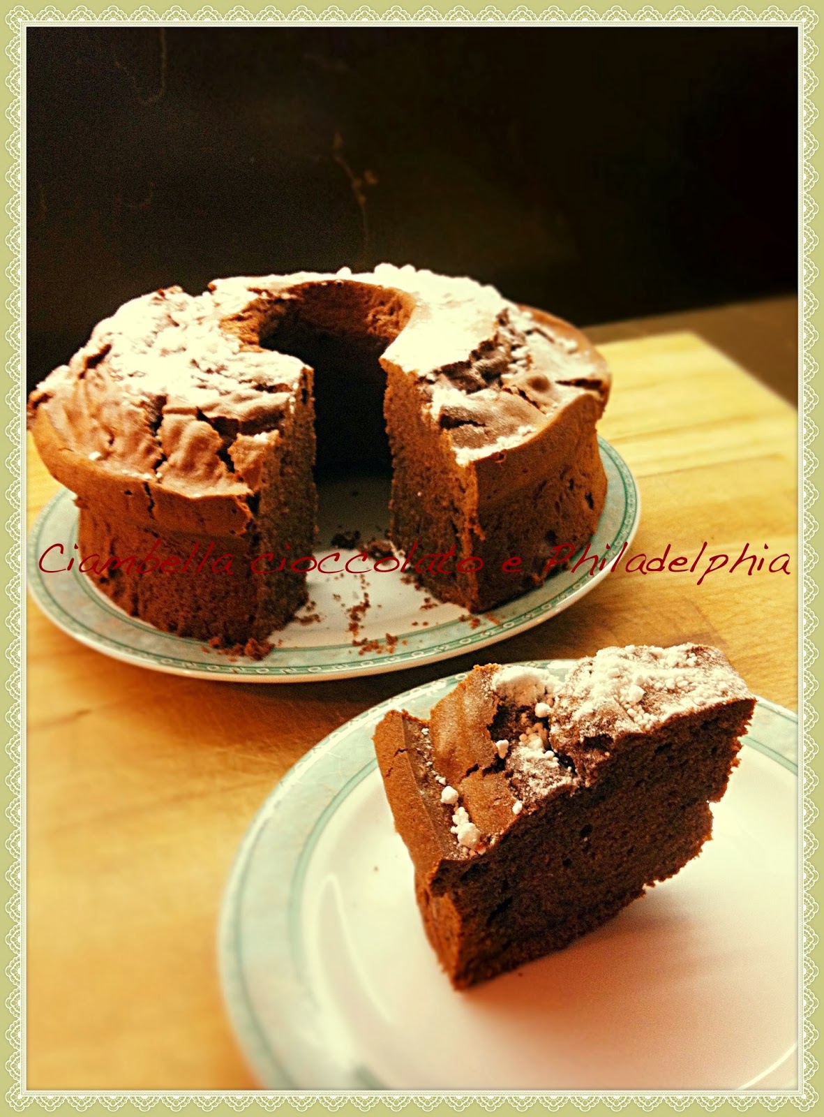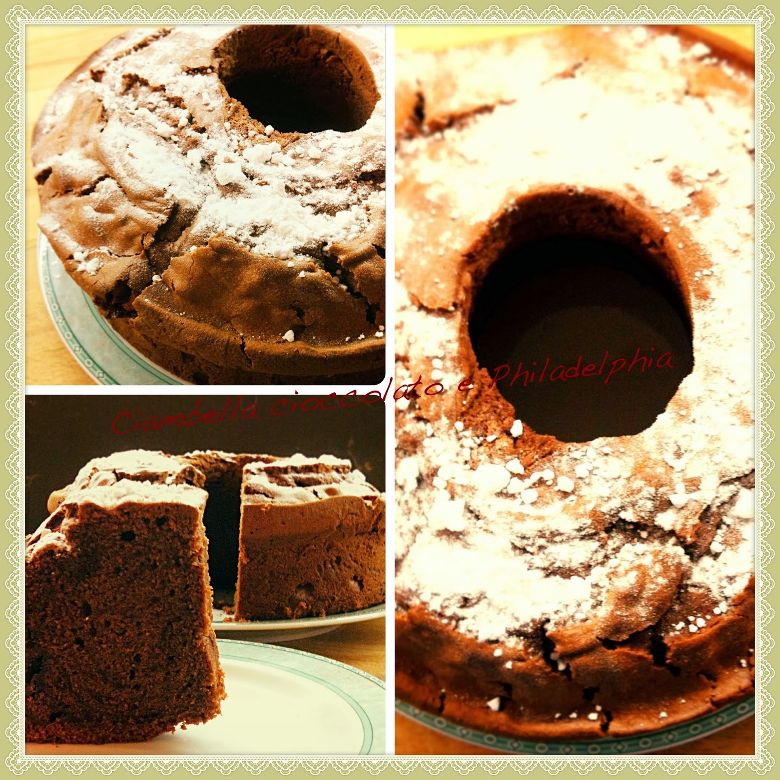 Con lo sbattitore elettrico, montate gli albumi a neve con un pizzico di sale e 150 grammi di zucchero. Montate separatamente i tuorli delle uova con gli altri 150 grammi di zucchero rimanente, rendendo il composto bello spumoso. Sempre mescolando con lo sbattitore, aggiungete un po' per volta l'olio, il formaggio, il latte, la vaniglia, il preparato al cioccolato e infine la farina. Unite i due composti e mescolate a mano delicatamente. Versatelo in uno stampo a ciambella imburrato e infarinato e cuocete nel forno preriscaldato. Per quanto riguarda quest'ultima indicazione, io ho cotto la ciambella a 150°C nel forno ventilato per 60 minuti, ma chiaramente regolatevi sempre in base al forno che possedete in casa. Alcuni forni hanno bisogno di una temperatura più elevata e/o di una cottura più lunga. Sfornate il dolce, fatelo raffreddare su una griglia e spolveratelo di zucchero a velo.