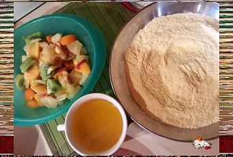 Pulite tutta la frutta e tagliatela a cubetti. In una ciotola unite le farine e la polvere lievitante,