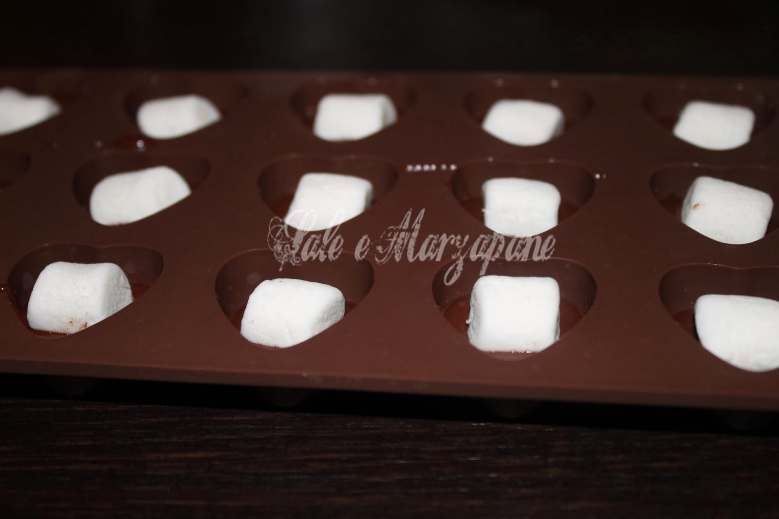 Cominciamo con il ricordare che fondere semplicemente il cioccolato e successivamente raffreddarlo senza averlo temperato non garantisce la giusta lucentezza ai nostri cioccolatini, questo perchè il cioccolato solidificherebbe ad un punto di fusione troppo basso con la formazione di una patina biancastra ed opaca dovuta al burro di cacao che cosi facendo riaffiorerebbe in superficie. Per evitare tutto ciò è fondamentale temperare il cioccolato in modo da ottenere dei cioccolatini lucidi, brillanti, facilmente estraibili e che si conservino più a lungo. Cominciamo fondendo a bagnomaria (attenzione che il pentolino del cioccolato non tocchi mai l'acqua) ad una temperatura intermedia tra i 40° e i 45°.Una volta fuso il cioccolato, toglierlo dalla pentola conl’acqua e mescolarlo per una decina di minuti, il tempo in cui la temperatura raggiunge i 29°, una volta raggiunta questa temperatura, si riporta il tutto a bagnomaria e si porta il cioccolato a 31°.Ovviamente il temperaggio richiede l’uso di un termometro da pasticceria.A questo punto coliamo il cioccolato fuso fino alla metà degli stampini (io ho utilizzato uno stampo in silicone a forma di cuoricini, anche se si otterrebbe un miglior risultato usando stampi in policarbonato), porre al centro un mini marshmallow ( potete utilizzare anche quelle grandi tagliate a pezzetti) e coprire con il restante cioccolato fino a raggiungere il bordo degli stampini.