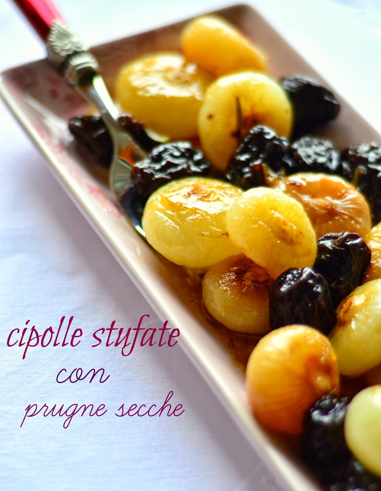 Immergere le prugne in acqua tiepida per farle rinvenire.Cuocere a fuoco vivo le cipolle in una padella antiaderente con 4 cucchiai d'olio.