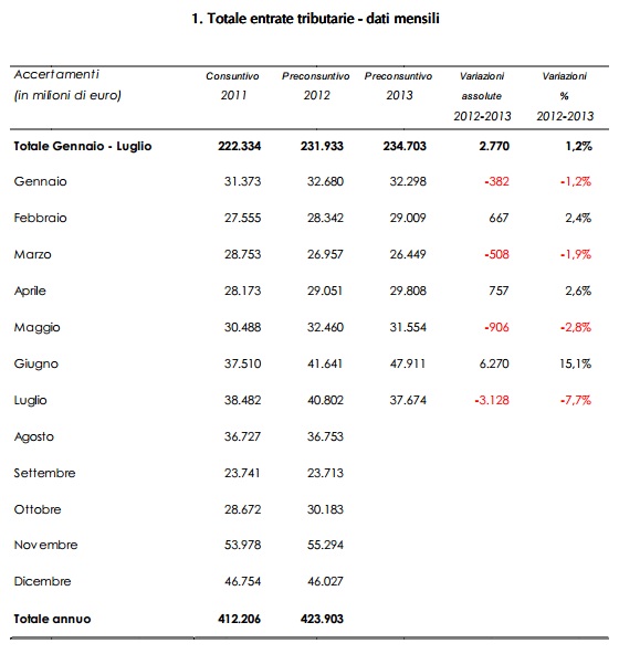 imprese ad adeguarsi ai ricavi determinati dagli studi di settore. Pertanto, a minor reddito dichiarato sarebbe corrisposto anche un minor gettito tributario. E' evidente. In attesa che l'Agenzia delle Entrate, tra qualche mese (forse), ci confermi la fondatezza delle nostre supposizioni in merito ai dati aggregati sull'adeguamento agli studi di settore da parte dei soggetti coinvolti, per il momento la conferma arriva proprio dal Ministero dell'Economia e delle Finanze che qualche giorno fa ha reso note le entrate tributarie del periodo Gennaio/Luglio 2013. Al netto della propaganda che accompagna il comunicato del Ministero, è bene notare che a luglio del 2013 (mese, insieme ad agosto, nel quale le imprese tipicamente liquidano le imposte) le entrate tributarie hanno subito un crollo del 7.7% rispetto allo stesso mese dell'anno precedente, ed è verosimile attendersi che questo trend continui anche per il mese di agosto.