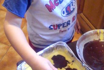 adesso aggiungete a questa parte di impasto tre cucchiai di cacao in polvere amaro (io uso quello bio) e aggiungeteci anche un altro paio di cucchiai di zucchero..per rendere anche la parte "scura"della torta un po' più dolce.Sistemate il composto "bianco" in una teglia da forno imburrata o coperta di carta da forno e poi a cucchiaiate buttate qua e là il composto "scuro" in quello "chiaro"in modo da creare vortici e cerchi..fate finta di dipingere un quadro ;).(questa è la parte preferita da Mister G).