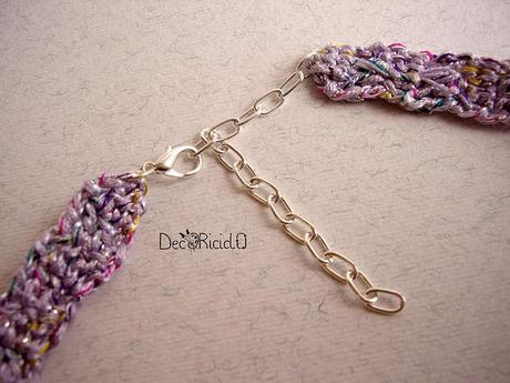 Nella foto qua sopra, un dettaglio della disposizione delle linguette e della lavorazione all'uncinetto; nella foto sotto, un particolare della chiusura, che rende la collana regolabile grazie alle maglie della catenella.