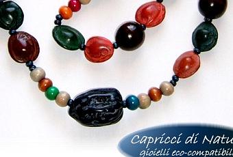 Pochi sono ancora i pezzi disponibili. Oggi propone uno dei primi modelli, Geo, composto da noci, noci naturali dell’Amazzonia e noccioli di albicocca. La completano appunto le perle in legno nei vari colori. E’ lunga circa 100 cm, non ha ganci di chiusura ed è montata su filo da pesca. Per vedere gli altri colori potete cliccare qui