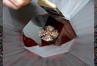 Dopo aver incollato l’intarsio di madreperla, si applica il quinto strato di lacca naturale alla superficie e si lascia asciugare. Una volta asciutta, si leviga la superficie del vassoio con della carta vetrata bagnata. Si ripete il processo una seconda volta ed infine si applica il sesto strato di lacca naturale.