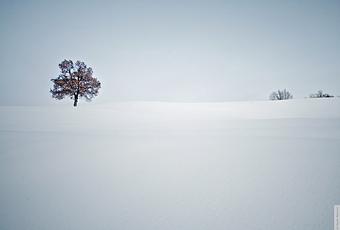 Sono indeciso, quando guardo questa immagine, se reinquadrare lo scatto tagliando via le due chiome che spunatano a destra: alla fine credo che aiutino ad equilibrare la composizione e permettano di lasciare molto spazio intorno al soggetto principale, rafforzando il suo “abbandono” in mezzo alla neve. Il vero soggetto non è l’albero in sè ma lo “spazio” innevato e la sensazione di pace ed eleganza della scena
