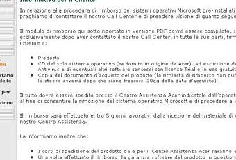 Sono qui disponibili i moduli necessari per il rimborso del sistema operativo da parte di Acer, e qui è disponibile un pratico schema che illustra come procedere e l’entità del rimborso