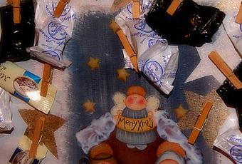 Sul tetto della capanna e sotto i piedi dei personaggi distribuire la pasta neve in modo disomogeneo. Con la colla a caldo applicate le mollette cui saranno agganciati cioccolatini, torroncini, caramelle e dolcetti vari. I vostri bimbi lo adoreranno!!!