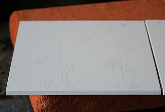 con acrilico arancio e pennello ho realizzato la decorazione sulle ante e sulla parte superiore del camino sul muro: