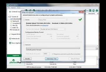 La procedura per ottimizzare uTorrent su Windows è semplice e immediata, infatti, potrete affidarvi alla configurazione automatica del programma che analizza la velocità della connessione ADSL. Per avviare la procedura, non dovrete far altro che selezionare Setup Automatizzato/Opzioni e Avvia Test per avviare il controllo di banda e network.