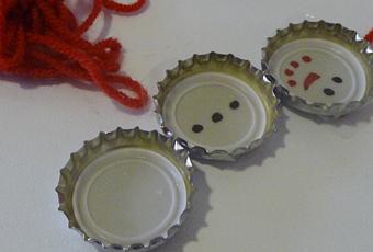 Dei 3 tappi ne decorerò solo 2, l’ultimo servirà solo per creare la forma completa del pupazzo di neve; un tappo lo decorerò semplicemente con 3 puntini neri che mi rappresentano i bottoni mentre all’interno dell’altro tappo andrò a disegnare gli occhi, il naso e la bocca. Ora basterà unire i 3 tappi con un filo di lana che incollerò sul retro, nella parte dove non sono disegnati, lasciando però un pò di spazio tra un tappo e l’altro così che si possa intravedere il filo; nella parte alta lascio il filo un pochino più lungo così da poter creare una specie di asola che ci permetterà di appendere il pupazzo dove vogliamo. Che ne dite? Speriamo di riuscire nel tentativo di richiamare la neve così almeno potremo creare un vero pupazzo di neve in giardino.