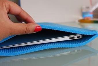 5. Porta pc: misurare la sagoma del vostro laptop sul tappetino, aggiungere 2 cm per lato e tagliare due pezzi identici della sagoma ottenuta. Per finire incollare i due pezzi su tre lati con colla a caldo.