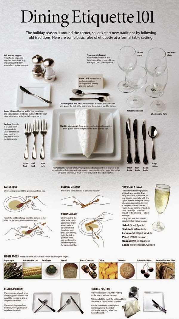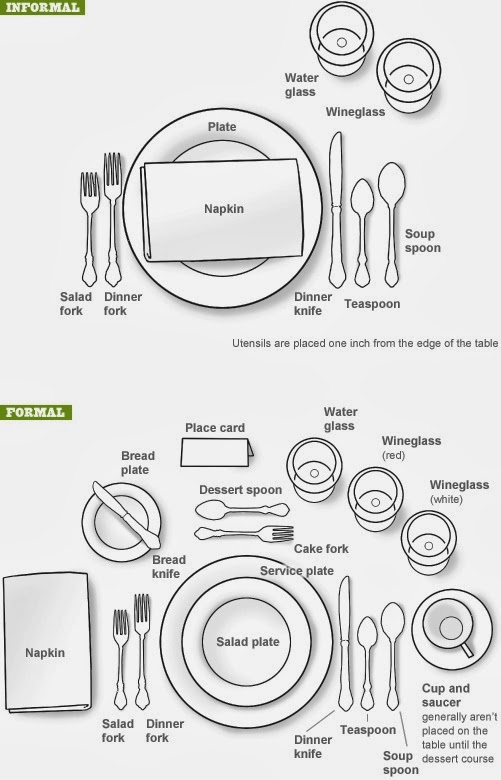 Se c'è una cosa che noi donne ci chiediamo puntualmente ogni volta che apparecchiamo la tavola prima di un brunch o cena formale è: come devo apparecchiare la tavola? O meglio, quante posate devo mettere? E come devo posizionare i bicchieri? Con questo post ho deciso di aiutarvi e di mettere finalmente un punto a tutti i dubbi e le paranoie che ci vengono in mente nell'ambito ''Galateo a tavola''. Ecco alcune regole generali per gli ospiti e per gli organizzatori...1) Per prima cosa la tavola deve essere abbastanza grande per far sentire i nostri ospiti a proprio agio.2) L'eleganza e il buon gusto non devono essere tralasciati in quanto dimostrano, la cura dei padroni di casa verso i propri invitati.3) Appena ci sediamo dobbiamo ricordarci di spiegare il tovagliolo e di porlo sopra le nostre ginocchia.4) E' vietato l'uso dello stuzzicadenti e (ovviamente) di masticare con la bocca aperta. 5) Non dobbiamo MAI rifiutare le pietanze offerte neppure se non sono gradite.6) Il pane non si taglia, ma semplicemente si spezza.Dettò ciò ora possiamo concentrarci sulla temutissima ''Mise En Place'' ovvero le due apparecchiature divise tra informale cioè quella quotidiana, e la formale dove si aggiungono bicchieri e forchette per il dessert, il piattino per il pane e una piccola etichetta con il nome (usanza anglosassone).
